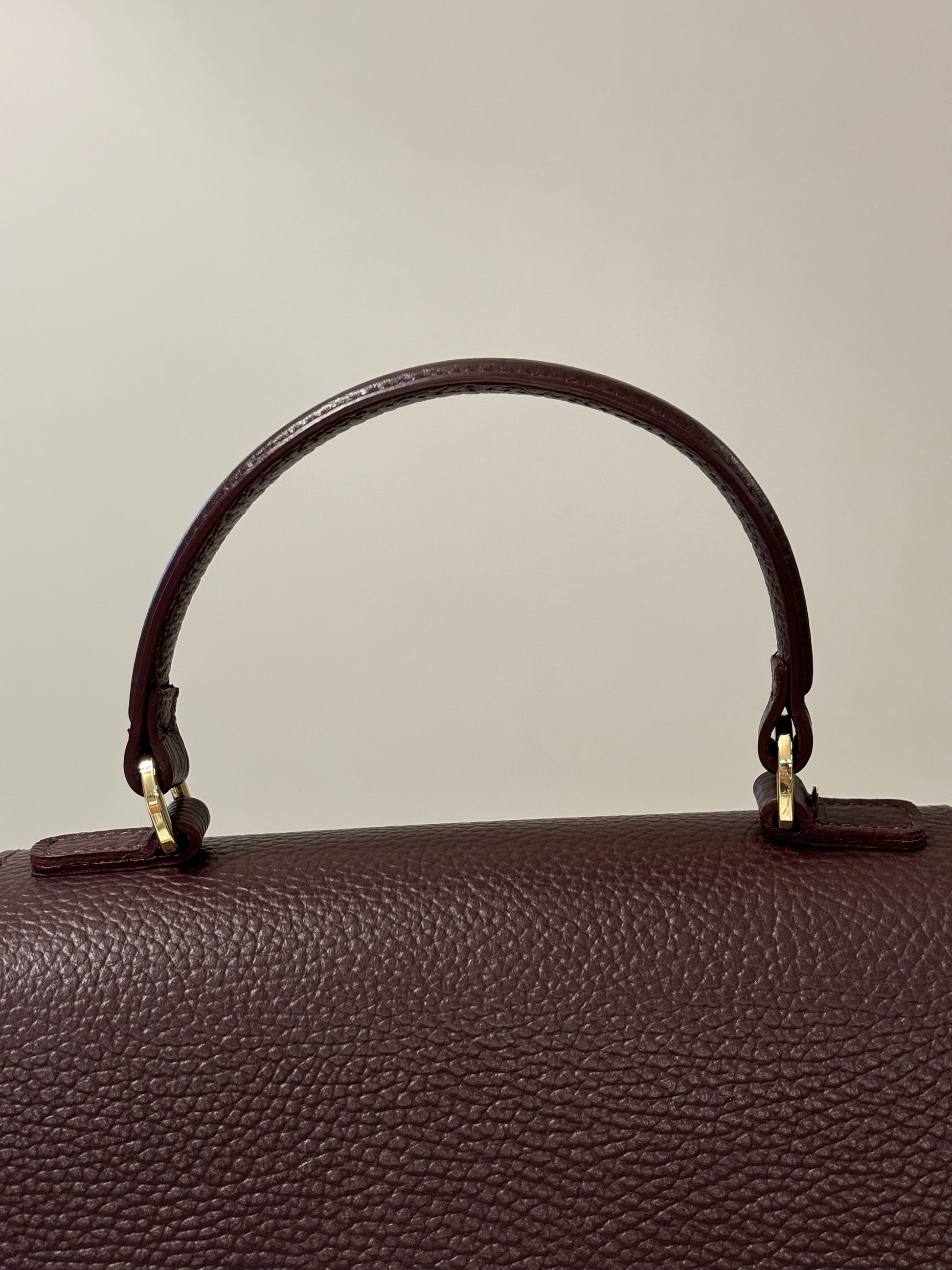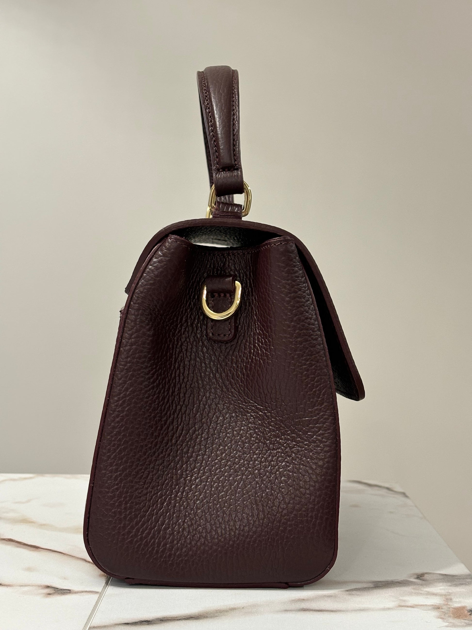 Realizzata in pelle dollaro e impreziosita dal logo frontale in metallo. La borsa ha una chiusura a scatto, che assicura praticità e sicurezza, mentre la base è dotata di piedini metallici che proteggono il fondo e preservano la forma nel tempo. I ganci laterali permettono di indossarla a mano, a spalla o a tracolla, rendendola un accessorio estremamente versatile.