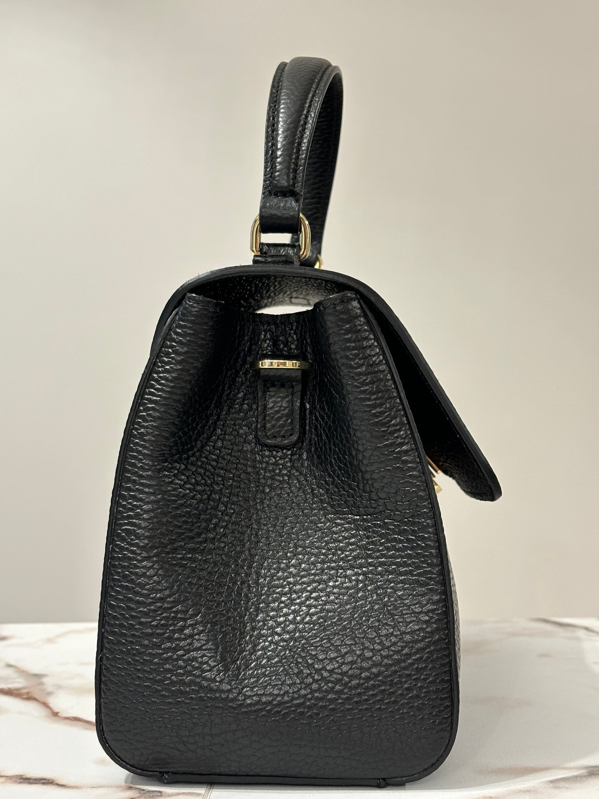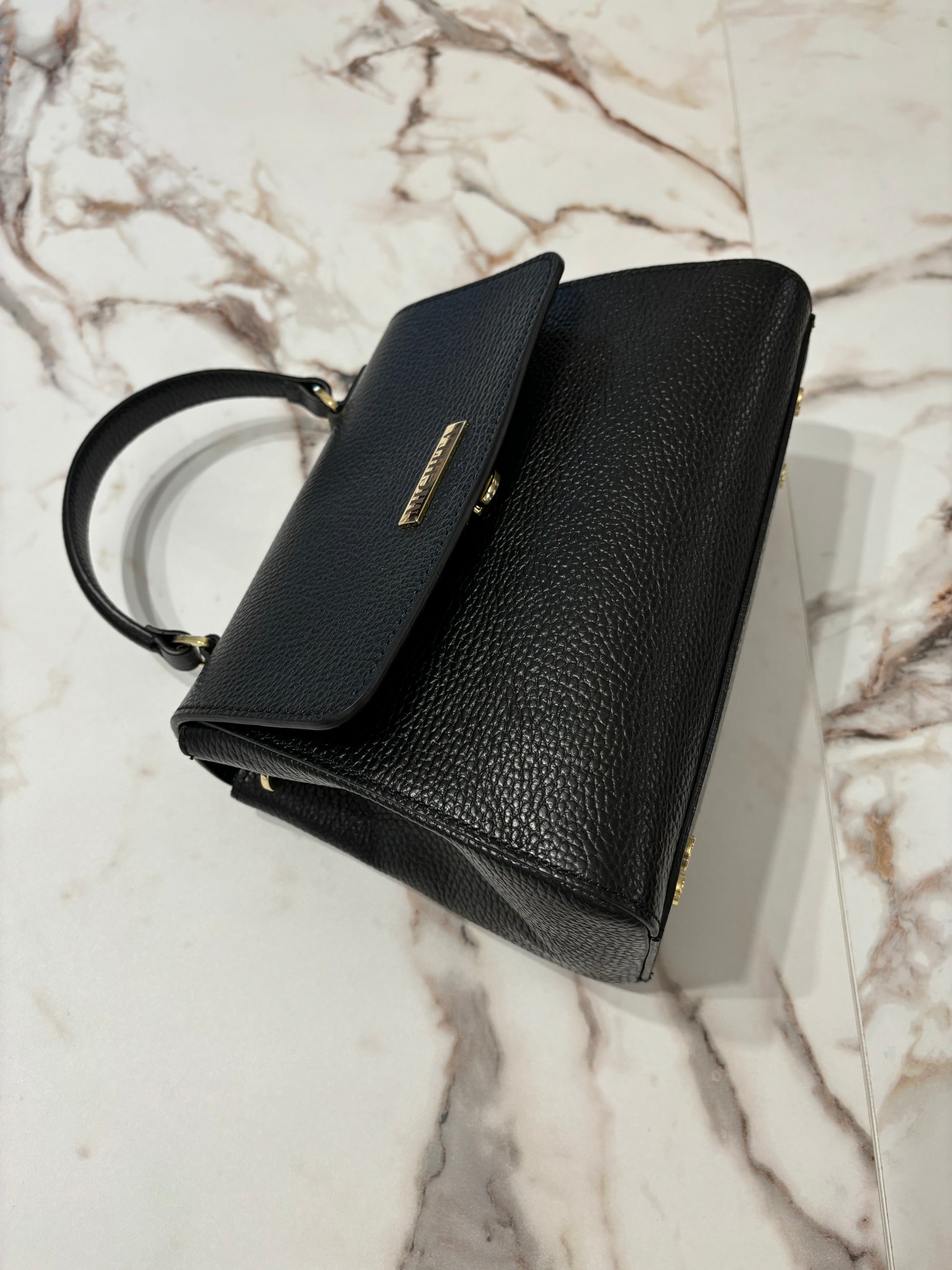 Realizzata in pelle dollaro e impreziosita dal logo frontale in metallo. La borsa ha una chiusura a scatto, che assicura praticità e sicurezza, mentre la base è dotata di piedini metallici che proteggono il fondo e preservano la forma nel tempo. I ganci laterali permettono di indossarla a mano, a spalla o a tracolla, rendendola un accessorio estremamente versatile.